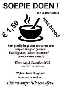 Iedereen is van harte welkom om aan te schuiven en te genieten van een heerlijke kom soep voor slechts € 1,50. Graag contant betalen.