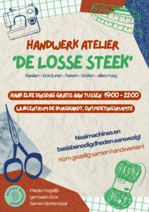 Alles kan. Het is een open, gratis inloop voor iedereen die het leuk vindt om te handwerken. Het ervaringsniveau is verschillend, dus we helpen elkaar waar nodig. Naaimachines en basisbenodigheden zijn aanwezig. Dus kom gerust een keer binnenlopen om kennis te maken met de Losse Steek!